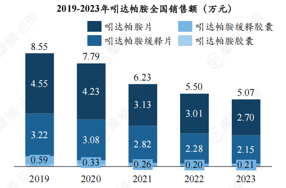 吲达帕胺片于2020年纳入第二批国家集采,近五年销售额下滑趋势明显,从2019年8.55亿元降至2023年5.07亿元。2023年吲达帕胺片、缓释片、缓释胶囊、胶囊销售额分别约2.70、2.15、0.21、0.01亿元。