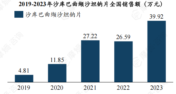 沙库巴曲缬沙坦钠片为诺华独家品种,于2015年获得美国FDA批准,并于2017年在中国上市,商品名为诺欣妥。近五年,诺欣妥在我国市场销售额呈现爆发式增长,从2019年4.81亿元显著增长至2023年39.92亿元。
