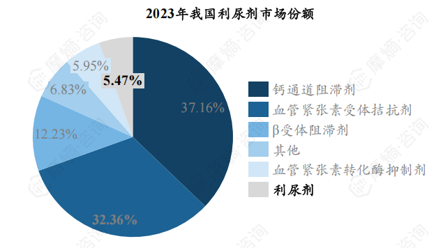 在五大类一线降压药中,利尿剂为市场份额最小的一类,2023年份额约5.47%,远不及钙通道阻滞剂(37.16%)和血管紧张素受体拮抗剂(32.36%)等类别。