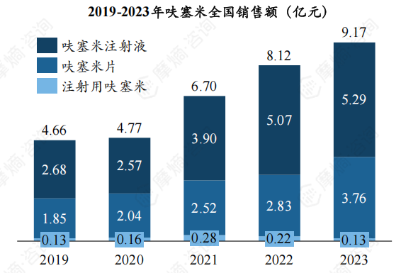 近五年我国呋塞米产品销售额显著增长,从2019年的4.66亿元增长至2023年的9.17亿元,增长约一倍。2023年呋塞米注射液、呋塞米片、注射用呋塞米三种剂型产品销售额分别为5.29、3.76、0.13亿元。
