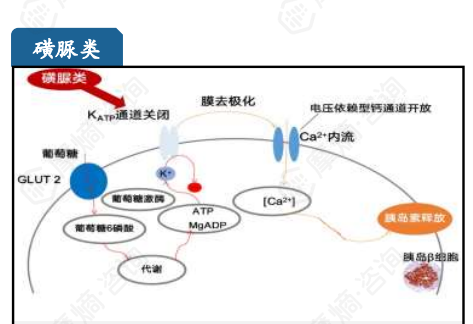 刺激β细胞分泌胰岛素,其作用于β细胞膜上的ATP敏感的钾离子通道,促进钙离子内流及细胞内钙离子浓度增高,刺激含有胰岛素的颗粒外移和胰岛素释放,使血糖下降