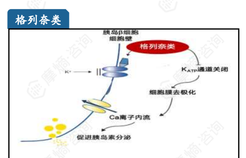 作用于β细胞膜上的ATP敏感的钾离子通道,但结合位点与磺脲类不同,是一类快速作用的胰岛素促分泌剂,主要通过刺激胰岛素的早时相分泌而降低餐后血糖,具有吸收快、起效快和作用时间短的特点