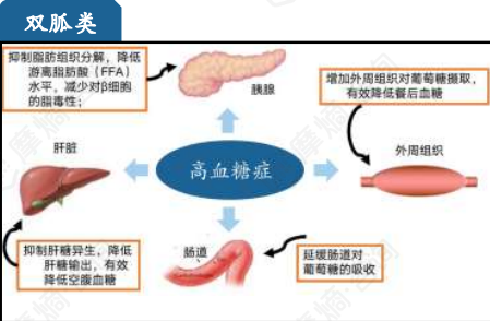 口服降糖药通过促进葡萄糖利用、抑制葡萄糖摄取、促进胰岛素分泌等机制降低血糖。通过抑制肝葡萄糖输出,改善外周组织对胰岛素的敏感性、增加对葡萄糖的摄取和利用而降低血糖