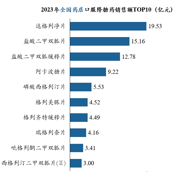 2023年全国药店口服降糖药销售额TOP10中,有5款药物销售额超过5亿元。