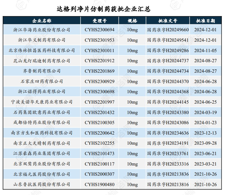 达格列净片由百时美施贵宝开发,全球销售权益已授予阿斯利康,这款产品最早于2012年获欧盟EMA首次批准,是全球首款获批用于治疗2型糖尿病的SGLT2抑制剂。达格列净片年销售额超60亿元,国内多家仿制药企强势入局。