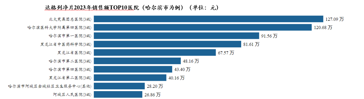 达格列净片2023年销售额TOP3医院(哈尔滨市为例)分别为北大荒集团总医院、哈尔滨医科大学附属第四医院、哈尔滨市第一医院。