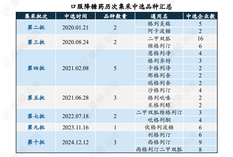 从第二批国家集采开始,各类口服降糖药陆续被纳入集采,纳入品种数量分别为第二批2个、第三批2个、第四批5个、第五批3个、第七批2个、第九批1个、第十批3个。