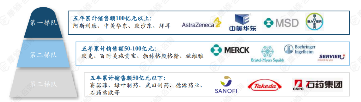 以近五年累计销售额进行排序,销售额为100亿元以上的第一梯队有四家,分别为阿斯利康、中美华东、默沙东、拜耳;销售额为50-100亿元的第二梯队企业有默克、BMS、勃林格殷格翰、施维雅四家,销售强劲的企业多为外资。