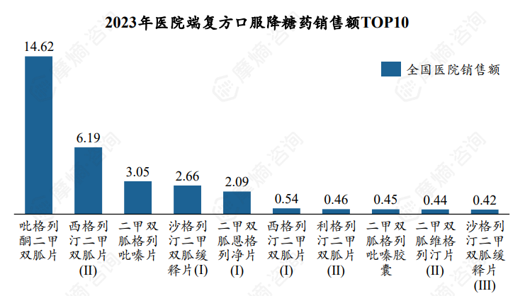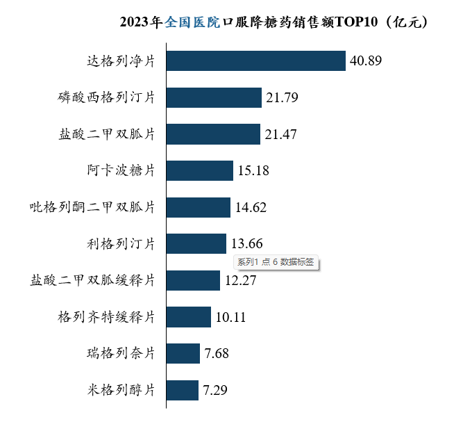 2023年全国医院口服降糖药销售额TOP10中,有8款药物销售额超过10亿元。