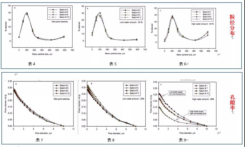 从以下表4和表7可知,在制粒工艺参数相同即加水量30%、叶轮速度4.75rpm、湿法制粒时间60s时,重复四次实验,各批次粒径分布和孔隙率均与显著性差异,重复性好;表5和表8设计因子的实验结果表明,在该些制粒参数的改变下即在加水量20%固定时,改变叶轮速度或湿法制粒时间,对颗粒分布和孔隙率几乎也没有太大影响;表6和表9在加水量40%固定时,改变叶轮速度或制粒时间时,在较高粒度范围(>400μm),粒径分布和孔隙率批次之间差别较显著。综上说明在加水量40%时,其他参数的改变对颗粒性质的影响较显著。我们可以基于1L规模批次的参数结果,选择30%水量表示为优化且稳健的湿法制粒工艺,选择40%加水量作为对工艺变化具有相对高灵敏度的工艺参数去用以评估放大规则的设计考量。