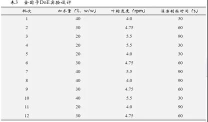 表2/3是DoE实验设计的参数水平研究及全因子实验设计方案。