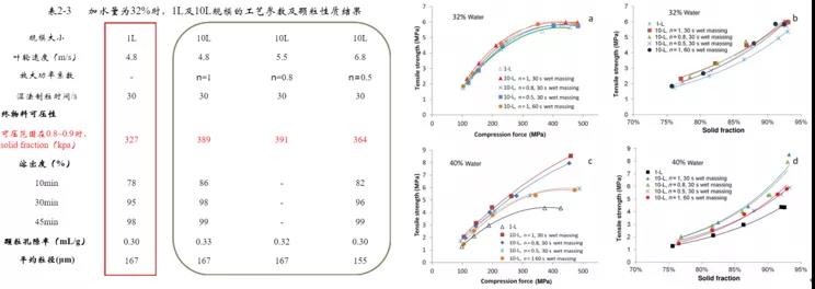 例如以下是基于不同放大规则,在不同搅拌桨速度下、固定制粒时间所得到的处方颗粒性质和溶出度结果,由结果可知:在加水量32%时,不同放大规则取值后颗粒性质变化较小,在该加水量下容易放大成功。
