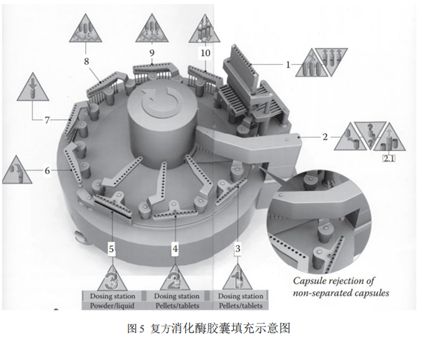 图5中的胶囊填充机可以切换不同的填充模块实现片剂、微丸、粉末和液体一种或多种搭配形式的填充(图7)。实现多种释放曲线(肠溶、控释、速释)的“混搭”释放模式或者解决复方制剂相容性、稳定性问题(化学稳定性和消化道内稳定性等)。