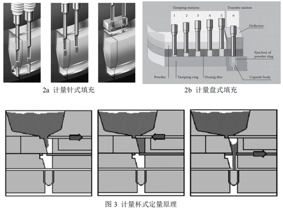 胶囊填充的主要核心为定量器,定量器主要为两种,计量针式(图2a)和计量盘式(图2b)。计量针式定量器主要由一个空心金属管和一个加载弹簧的可调节式活塞组成,可以通过金属管内的活塞调节管内体积来调节管内粉末的剂量,通过活塞将定量后的粉柱填充至空胶囊中。计量盘式定量器的工作原理是通过填充杆压缩流入计量盘中的粉末或颗粒(重复5次,保证剂量准确),并被第6岗位的填充杆推至空胶囊壳中。而这两种计量器主要适用于固体粉末和颗粒。而计量针式定量器可与真空模块相结合,实现微丸胶囊的定量填充。除此之外,还有另外一种计量板式微丸填充胶囊模块,工作原理见图3,图3为计量板式对微丸胶囊进行定量灌装:首先定量板层将下口堵住,上口打开,微丸流入定量板内;第二步,计量板转至填充位置,关闭上口;第三步,打开下口,定量板中的微丸在重力作用下流进胶囊壳中。该方法灌装效率较高,缺点是会有微丸在灌装时被挤压破裂。