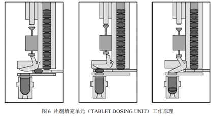 如图6所示,以先填充橙色片剂为例:在填充站1位置,片剂填充单元通过圆形数片部件定量片数,之后将片剂推至胶囊壳上方,将片剂压入衬套中并填充至胶囊壳中。此单元可通过机电设备或传感器验证进入胶囊壳内部的片剂的数量。为例确保片剂定量的正确性,理想情况下的片剂应该包衣(避免粉尘)且具有一定的斜边或弧形。此外,片剂的尺寸和硬度必须保持在严格的公差范围内,便于片剂填充至胶囊壳中。就个人看法而言,如果是新产品开发,建议将冲头设计成深凹或两种弧形相切的冲头。