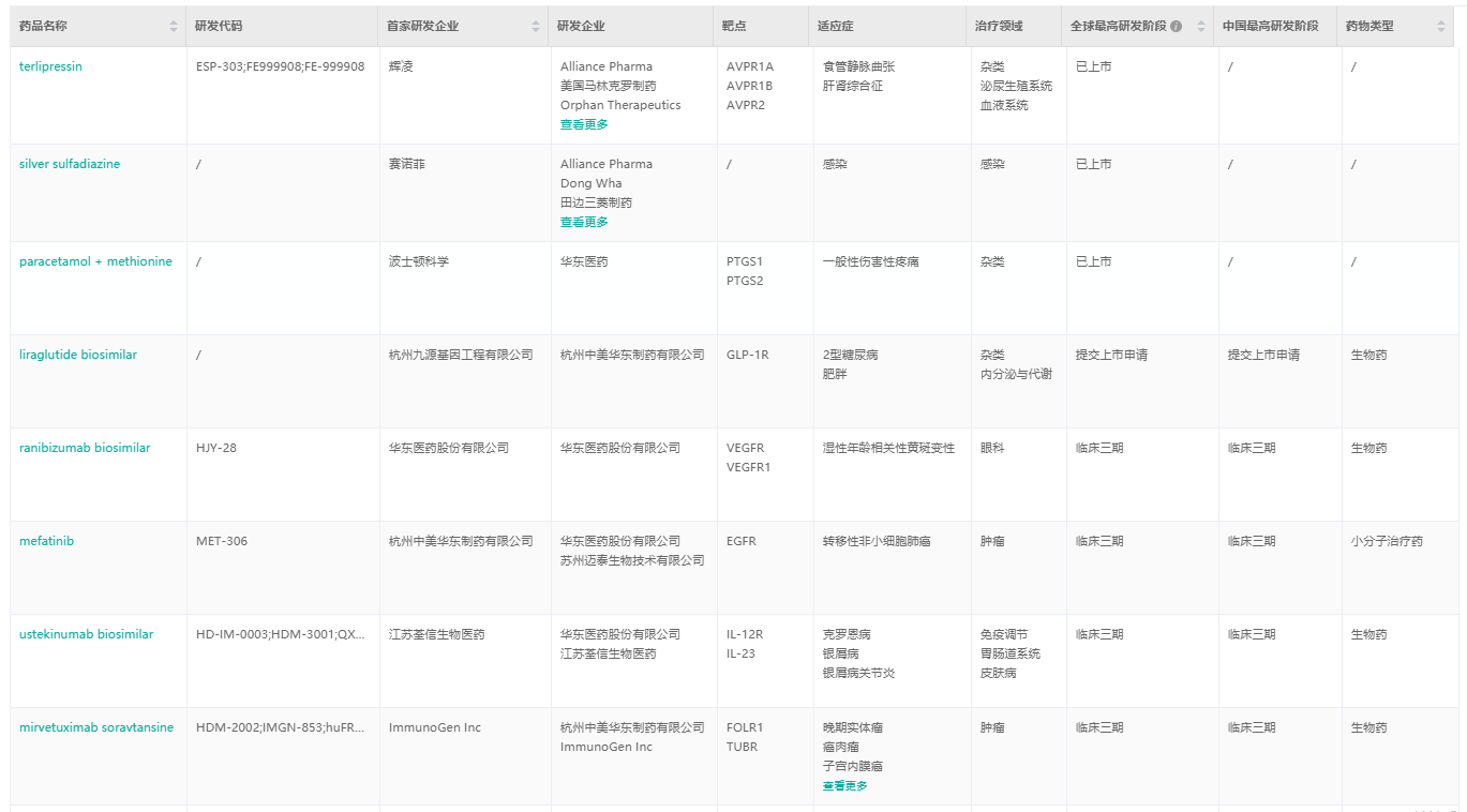 经药融云数据库查询,华东医药创新药全产品管线目前共有三款产品上市(特利加压素(terlipressin)、silver sulfadiazine、对乙酰氨基酚 +甲硫氨酸(paracetamol +methionine),华东医药全资子公司中美华东制药一款产品提交上市申请(利拉鲁肽类似药(liraglutide biosimilar)),另外还有多款产品正在进行临床试验。