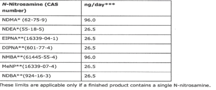 图4: 药物中常见7种亚硝胺杂质的可按受限度水平