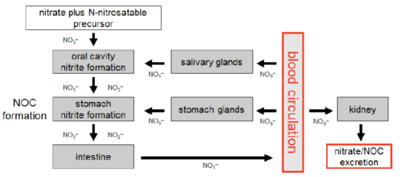 亚硝胺的内源性形成从20世纪60年代末的初步研究开始,到20世纪90年代结束。内源性形成的亚硝胺、亚硝酸盐和硝酸盐在代谢上相关,通过还原、氧化和循环在血液和组织中转化为活性亚硝胺,然后作为尿硝酸盐排泄。为了确定风险,必须提供有关其内源性形成的定量数据,了解亚硝胺的药代动力学。