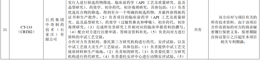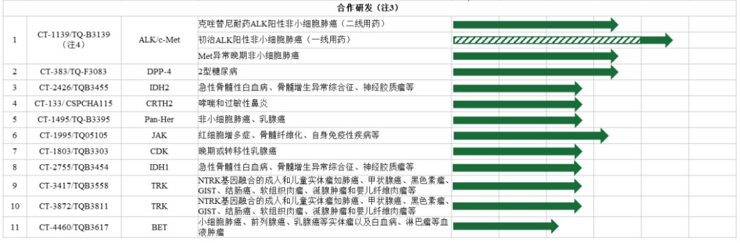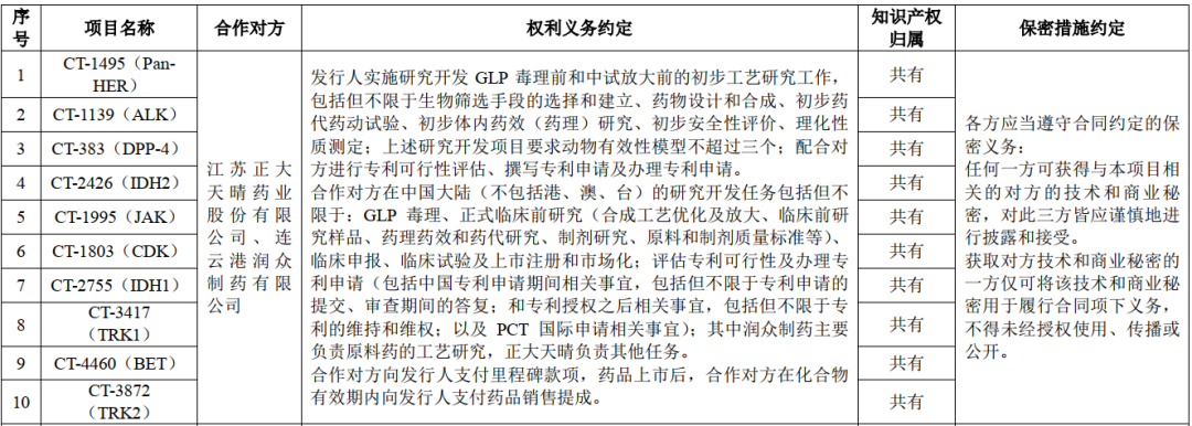 注:鉴于国家药审中心(CDE)2020年4月15日发布规定,“新修订的《药品管理法》实施(2019年12月1日)后提出的药品注册申请,不再受理两个和两个以上主体共同作为上市注册申请人的上市注册申请”, CT-1803、CT-2755、CT-3417、CT-3872、CT-4460项目根据协议约定由正大天晴和赛林泰共同具有知识产权,共同申报临床试验和新药上市,但临床试验实际申报方为正大天晴。公司仍可根据双方合同享有相关权益。