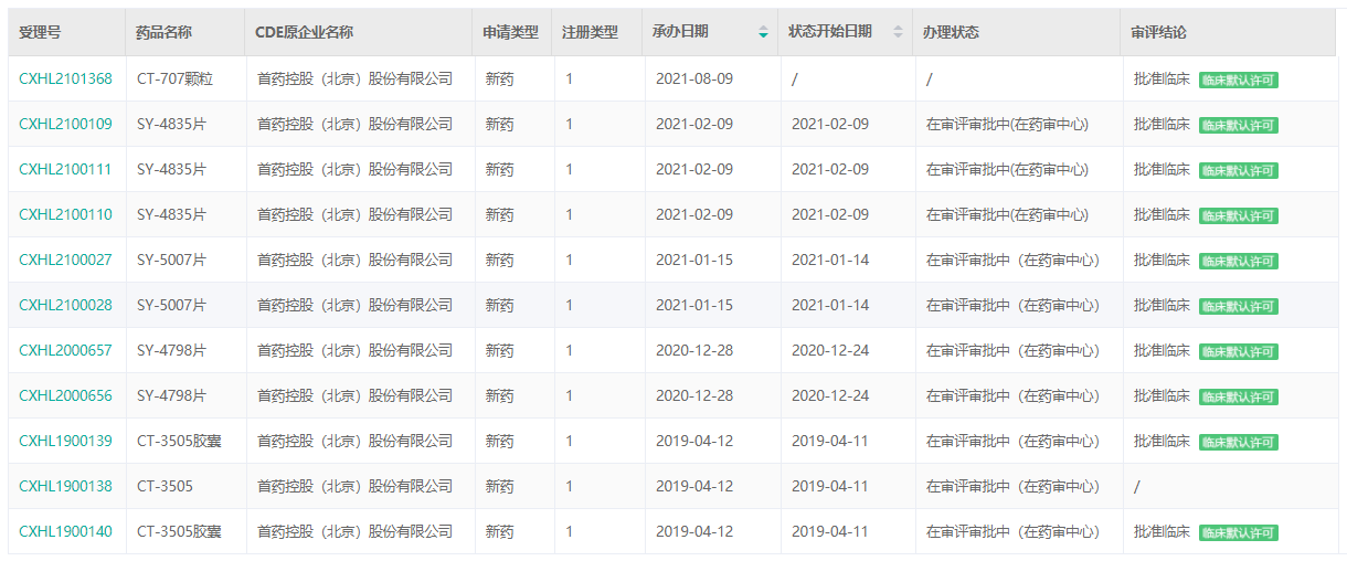 经药融云数据库查询,首药控股目前已向CDE递交了多款药物的临床申请,且都得到了临床默认许可。据统计,SY-4835片共3次;CT-3505胶囊、SY-4798片、SY-5007片各2次;CT-707颗粒一次。