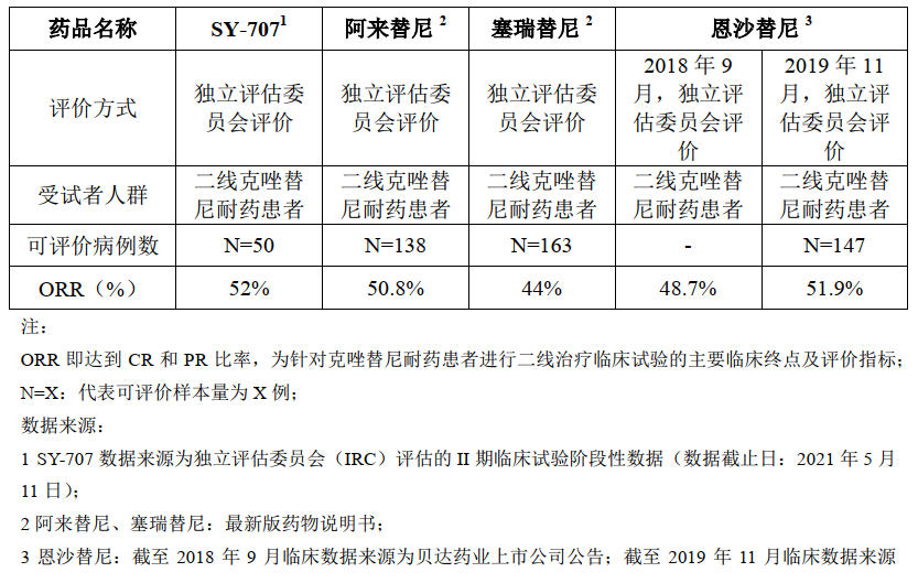 全球范围内,目前已上市的一代ALK 抑制剂为克唑替尼,二代ALK 抑制剂包括塞瑞替尼、阿来替尼、布加替尼和恩沙替尼,三代ALK 抑制剂为劳拉替尼。SY-707与阿来替尼、塞瑞替尼、恩沙替尼针对克唑替尼耐药患者二线治疗的临床试验的主要疗效数据如下: