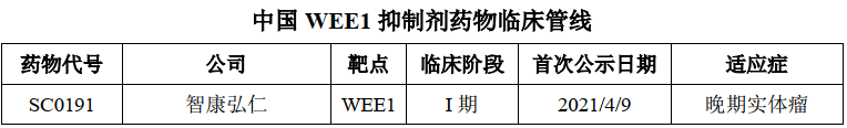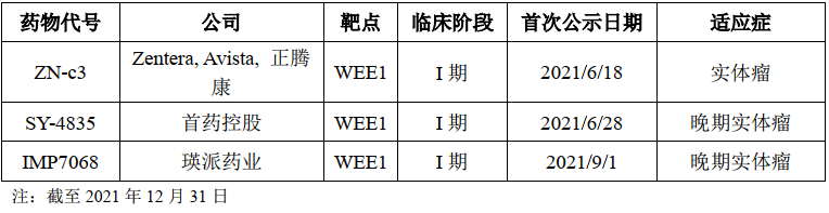 SY-4835拟用于治疗胰腺癌、卵巢癌、乳腺癌、肺癌等多种实体瘤,于2021年6月进入I 期临床研究阶段。目前,全球范围内尚无WEE1抑制剂获批上市。阿斯利康的AZD1775全球临床试验进展最快。