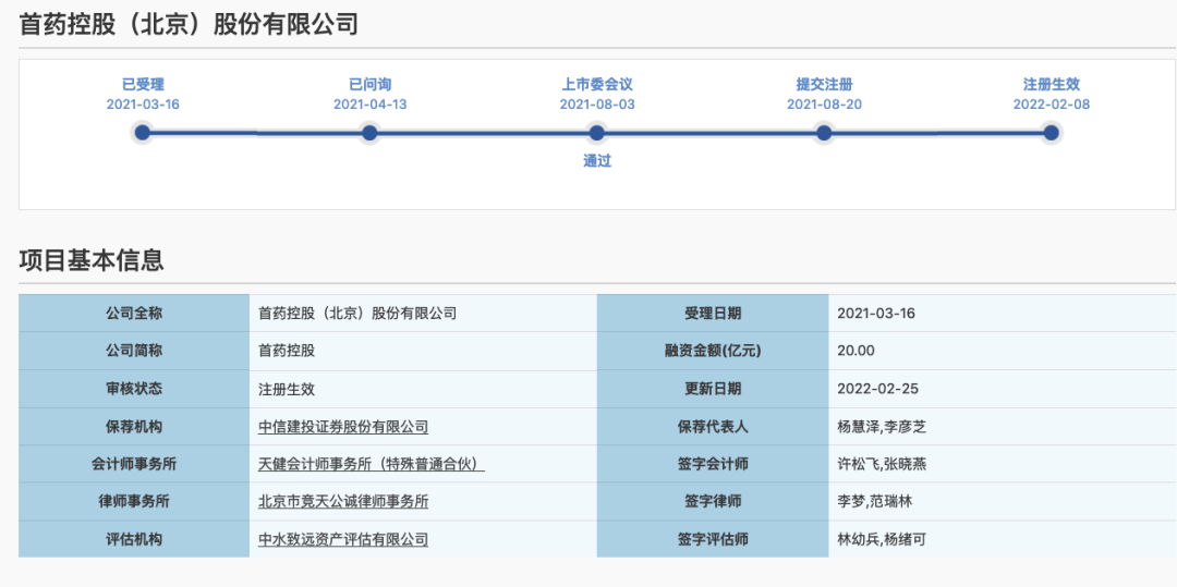 2022年2月8日,中国证监会发文按法定程序同意首药控股科创板首次公开发行股票注册。本次登陆科创板,拟募集资金20亿元资金,主要用于创新药项目研发与产业化基地建设等。本次IPO保荐机构(主承销商)为中信建投证券。