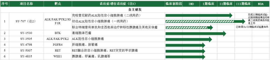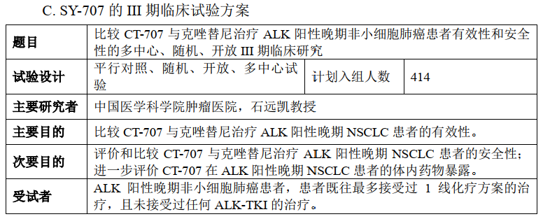 SY-707用于初治的ALK阳性非小细胞肺癌患者(一线治疗)的III 期临床试验于2020 年8月入组首例受试者,该临床试验的主要研究终点为经过独立影像评估的无进展生存期(PFS)。截至2021年12月31日,SY-707 III 期临床试验已完成入组。预计将于2023年递交新药上市申请(NDA)。
