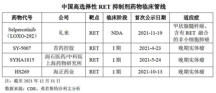 SY-5007 是第一款进入临床研究阶段的国产选择性RET 抑制剂,拟用于治疗RET阳性非小细胞肺癌及甲状腺癌,于2021年 4月进入I 期临床试验阶段。RET融合在非小细胞肺癌中的发生率约为2%,在乳头状甲状腺癌中的发生频率为10-20%。RET突变是甲状腺髓样癌(MTC)中常见的激活突变,50%的散发的甲状腺髓样癌和几乎全部的家族性的甲状腺髓样癌中都RET的突变。
