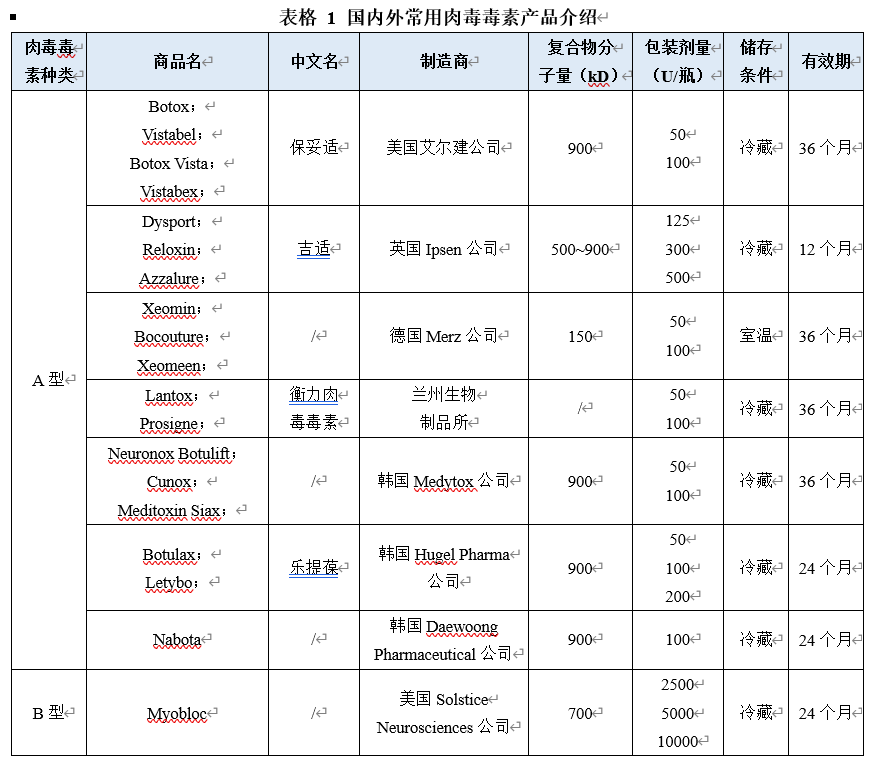 目前国际上常用的A型肉毒毒素主要有:保妥适(Botox,美国Allergan公司生产)、衡力肉毒毒素(我国兰州生物制品研究所生产),Dysport(英国Ipsen公司生产),Xeomin(德国Mertz公司生产),Neuronox(韩国Medytox公司生产),目前保妥适、衡力、吉适及乐提葆被批准在国内上市。
