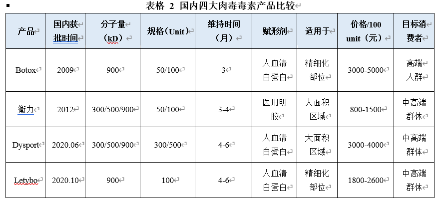 目前,中国市面上合规获批的肉毒素产品分别为中国的衡力、美国的保妥适与英国吉适、韩国乐提葆,衡力主要服务中低消费能力客户,保妥适凭借制作工艺、提纯度等优势站稳高端市场,而保妥适与乐提葆则定位中高端市场。除此之外,国内其他医美上市企业也开始布局肉毒毒素产品,主要方式为与国外成熟企业合作备案审批销售模式,如爱美客与Hunos合作的橙毒、华东医药与Jetema合作的蓝毒等,但距离上市仍有较长时间。
