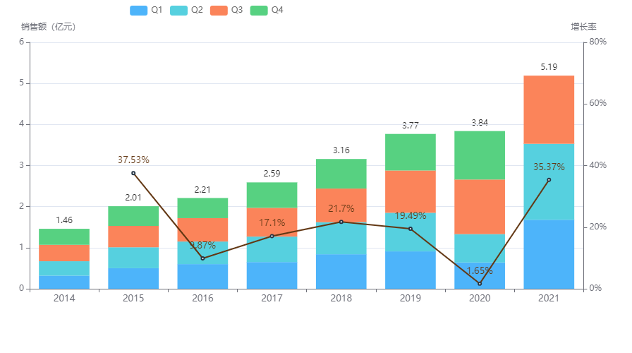 据药融云数据统计显示,A型肉毒毒素在我国院内的销售额一直是在缓慢递增。2021年前三季度的销售额已有5.19亿元,且Q1-Q3销售额一直保持在1.6亿元以上,预计全年将可向7亿元发起冲击。2021年将会成为有史以来销售额同比增长最快的一年。在生产企业方面,Allergan(占比52%)和兰州生物制品研究所(占比47%)占据国内市场。