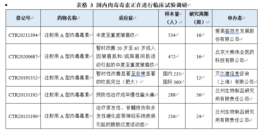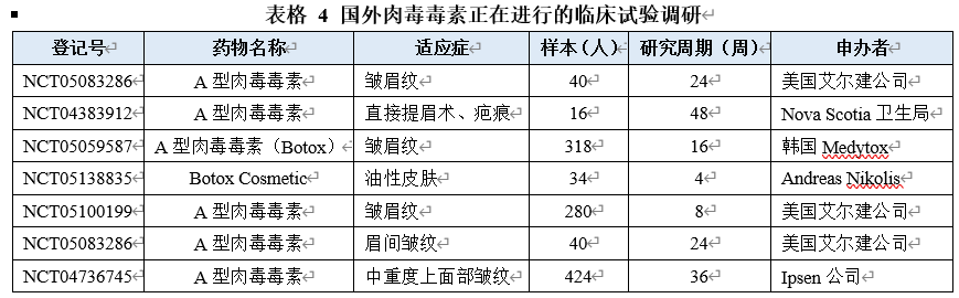 国内肉毒毒素正在进行的临床试验共5条,表3是其详细信息。