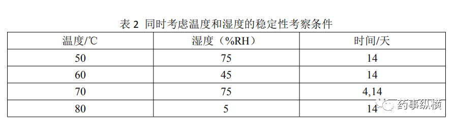 有研究者将温度和湿度结合,同时为稳定性考察的加速条件,构建起所谓的等转化方法,并推荐了一些适合在原辅料相容性考察应用的条件(见表2)。这种更为简单快捷的方法更加适合早期研究过程中的化合物取舍或原辅料相容性试验。
