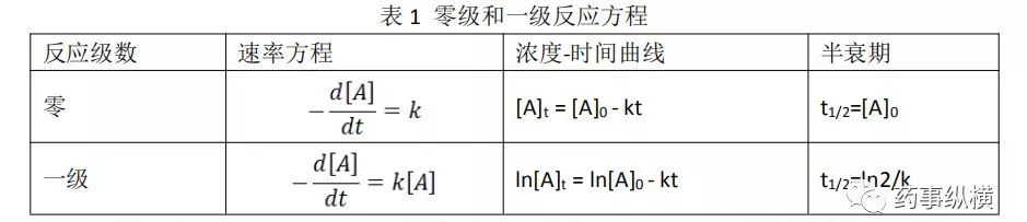 一般认为,在药物中的化学反应,尤其是在降解反应的早期,从表观反应速率上看,大多数符合零级反应或一级反应,即所谓的假零级反应或假一级反应,相关的速率方程如表1所示。