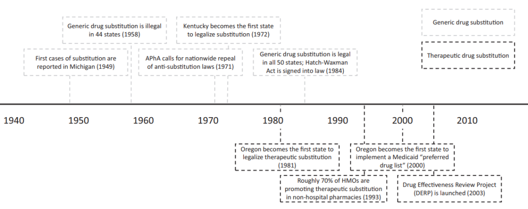 仿制药的历史可追溯到上世纪20年代,最早被仿制的药品是拜耳的阿司匹林。上世40年代晚期,美国已经有仿制药替代的概念出现,但受到当时美国品牌药行业组织“国家药品委员会”(NPC)的激烈反对。他们认为仿制药替代是扼杀创新,而且凭当时的技术理论难以证明仿制药与原研药的一致性。在NPC的作用下,美国医学会(AMA)和美国药师协会(APhA)也站出来反对,他们认为仿制药替代会削弱医生的作用,会违反药品行业的道德和标准。在几大行业协会的影响下,美国的各州开始陆续立法以反对仿制药替代,到50年代末,美国有44个州通过了反替代法。