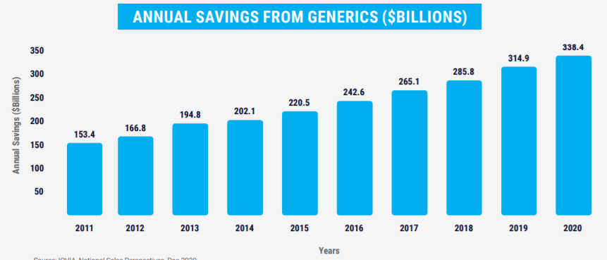 因为美国政府不能直接干预药品价格,所以美国并没有国家层面上的集采,但在GPO(药品集中采购组织)和PBM的多方作用下,仿制药因为残酷的市场竞争,价格几乎达到全球最低水平,90%以上处方量的仿制药仅消耗了美国药品总支出的18%,2020年为美国节省药品支出高达3384亿美元。