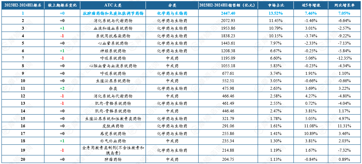 2023H2-2024H1中国院内外销售额TOP20 ATC大类治疗领域市场概况