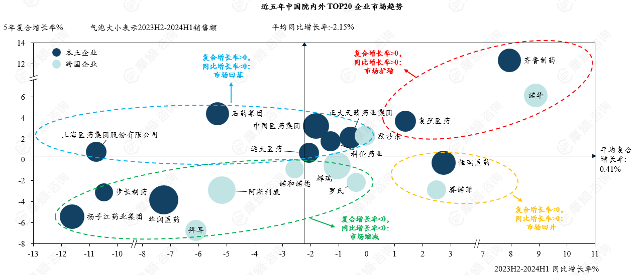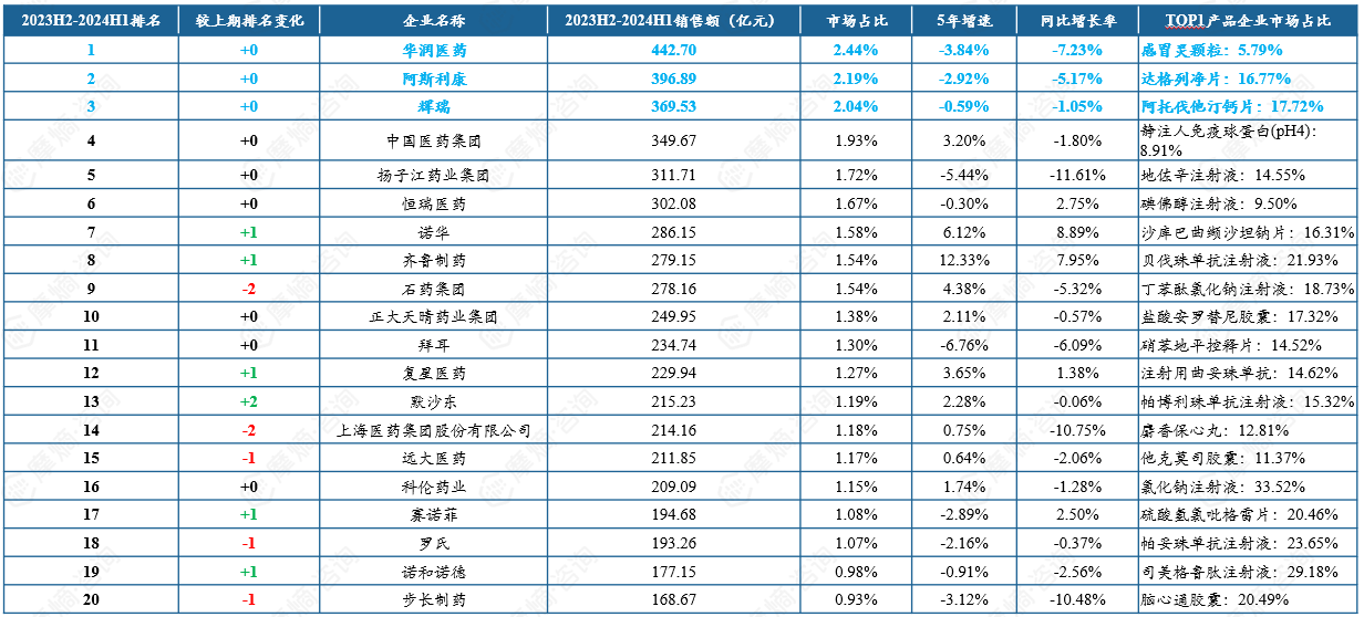 2023H2-2024H1中国院内外销售额TOP20企业市场概况