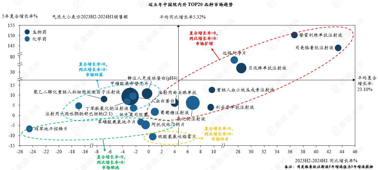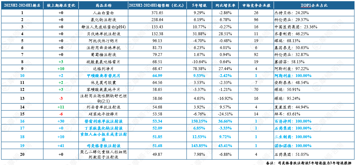 2023H2-2024H1中国院内外销售额TOP20品种市场概况