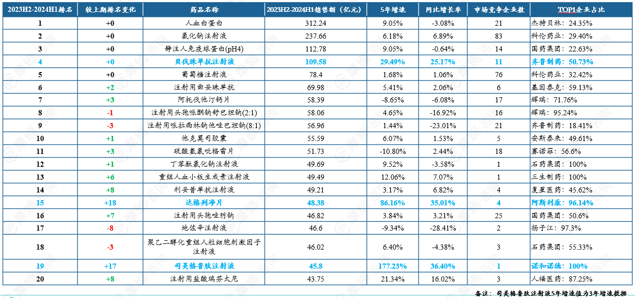 2023H2-2024H1中国医院端销售额TOP20品种市场概况