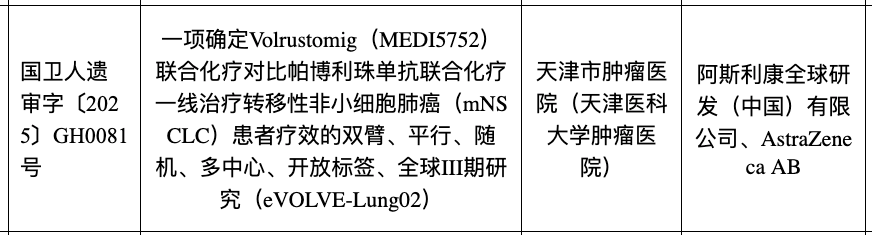 一项确定Volrustomig(MEDI5752)联合化疗对比帕博利珠单抗联合化疗一线治疗转移性非小细胞肺癌(mNSCLC)患者疗效的双臂、平行、随机、多中心、开放标签、全球III期研究(eVOLVE-Lung02)近期已在中国有序开展。中国临床试验登记号为CTR20250188。