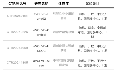 2025年1月24日,在中国开始开展Volrustomig治疗高风险局部晚期宫颈癌女性的全球3期临床研究(CTR20250226)。本次临床试验的主要终点是 PFS。该试验共有 213家site参与,国内计划入组130名受试者。全球临床研究命名eVOLVE-Cervical。