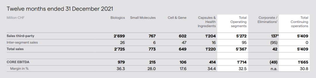 生物制品:受益于持续强劲的客户需求,2021年销售27亿瑞士法郎(约合184亿人民币),与2020年全年相比,该部门实现了24.7%的收入增长,核心EBITDA 利润率为36.3%,在医药健康的市场基本面的推动下,预计2022年销售增长势头继续。