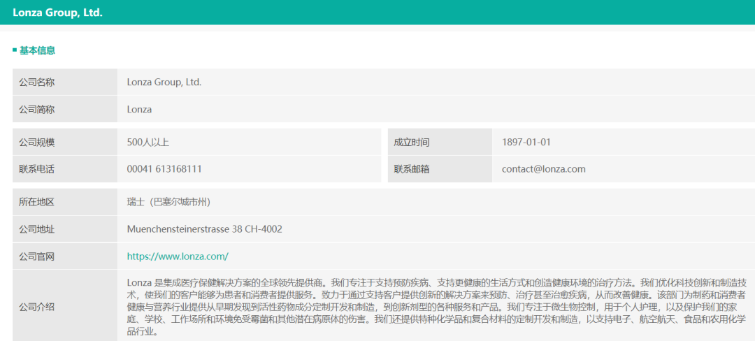 根据药融云数据库显示,Lonza(龙沙集团)于1897年成立,总部是瑞士巴塞尔,Lonza是一家以生命科学为主导,在生物制药、精细化工、生命科学等行业均处于领先地位的全球性跨国CDMO公司。