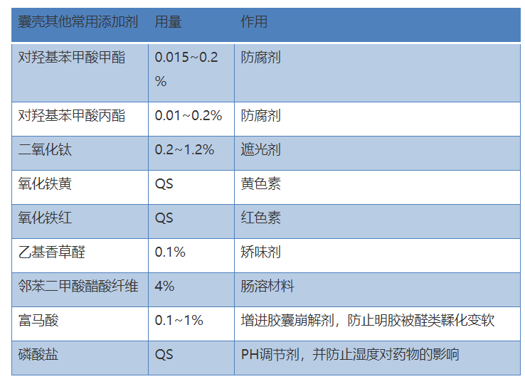 囊壳常用辅料包括明胶、增塑剂、水、着色剂、遮光剂、芳香剂、防腐剂。