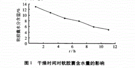 F)干丸、检丸:干丸即二次干燥,将胶囊放在不锈钢车盘上静置干燥即可,干丸阶段如果干燥时间太短,成品会过软,但干燥时间过长,囊壳又比较脆、易裂,所以一般控制使胶囊壳水分控制在8~12%,保证胶囊间不发生粘连。且具有良好的外形和手感。检丸即将外型、夹缝不合格的软胶囊挑拣出来,将合格的软胶囊送至下一工序。例如阿奇霉素软胶囊研究了干燥时间对软胶囊含水量的影响,参照时间结果,选择阿奇霉素软胶囊的干燥工艺条件为6~8h比较合适。