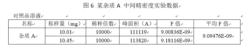 (2)至少用线性100%时杂质样品测定6次。一般要求连续进样6针,以峰面积计算6针样品的RSD%要小于2.0%,一般重复性实验与线性、范围实验一起做,重复性的进样浓度为线性100%处点浓度。