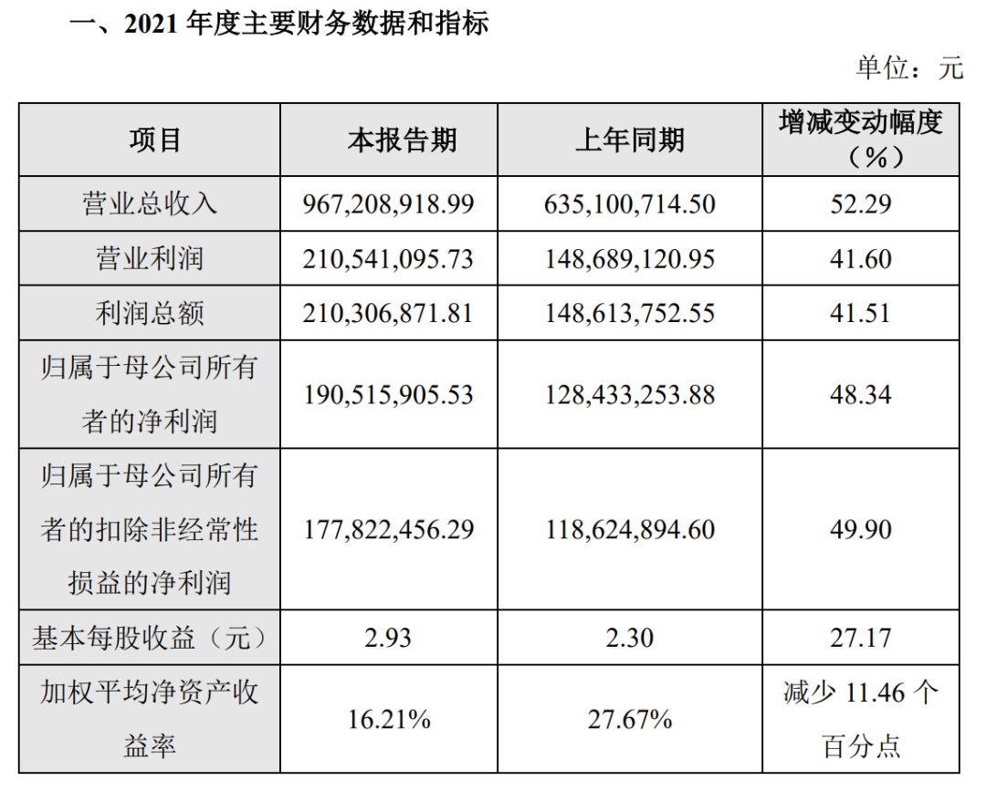 2021财年,皓元医药实现营业收入96,720.89万元,同比增长52.29%;实现归属于母公司所有者的净利润19,051.59万元,同比增长48.34%;实现归属于母公司所有者的扣除非经常性损益的净利润17,782.25万元,同比增长49.90%。报告期末,公司总资产238,523.76万元,较期初增长152.71%;公司归属于母公司的所有者权益为182,262.79万元,较期初增长247.80%。