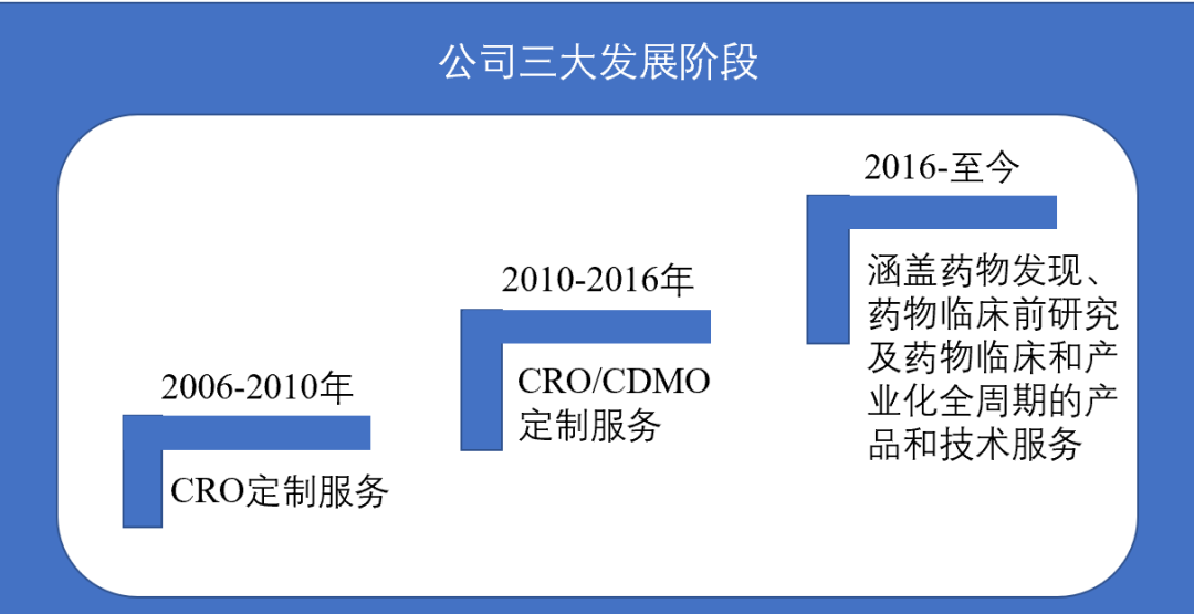 第三个阶段从2016年-至今,业务范围进一步拓宽,涵盖药物发现、药物临床前研究及药物临床和产业化全周期的产品和技术服务。